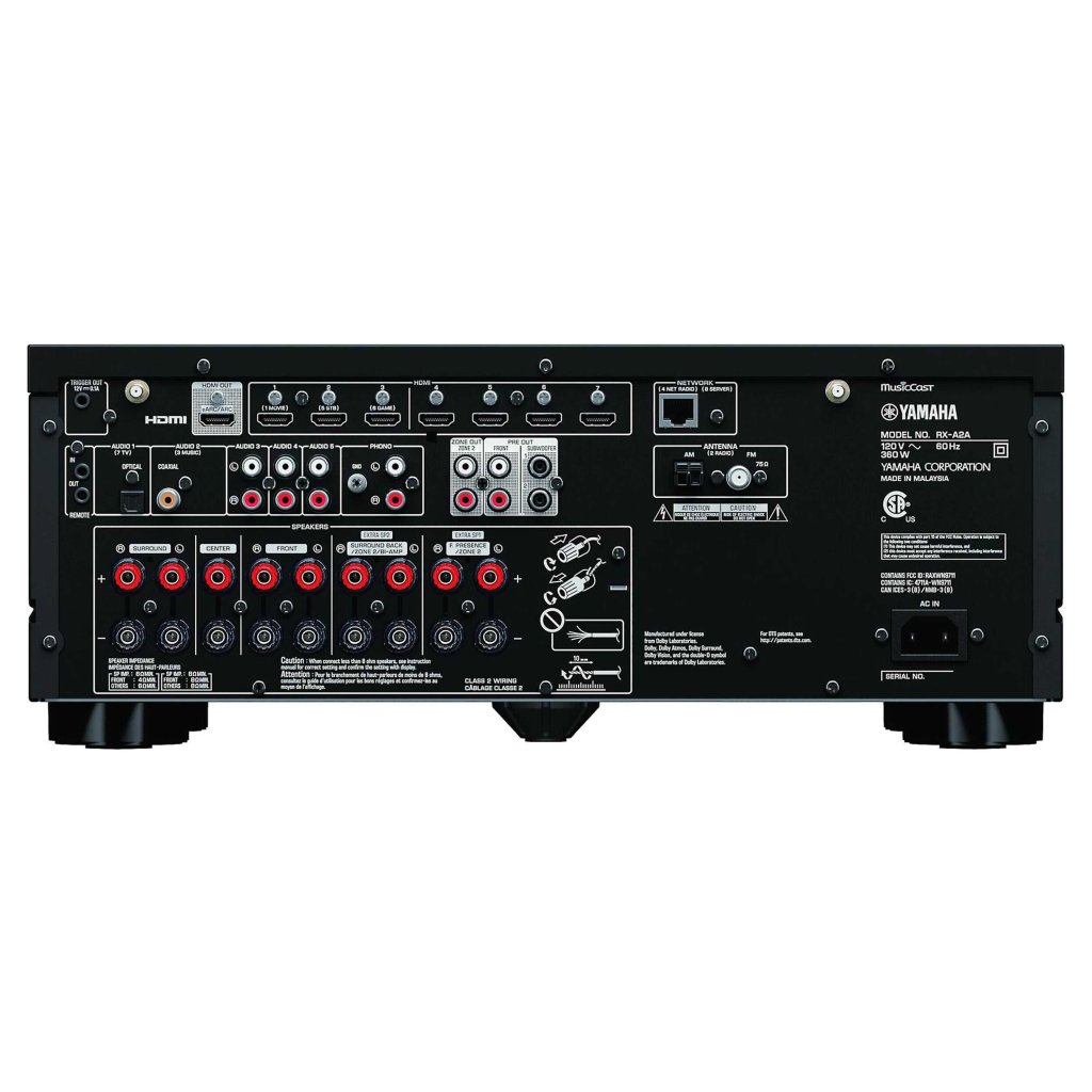- Výstupy pro 9 reproduktorů (Front L / R, Center, Surround L / R, Surround Back L / R, Front Presence L / R) - RX-A2A může napájet maximálně 7 kanálů najednou