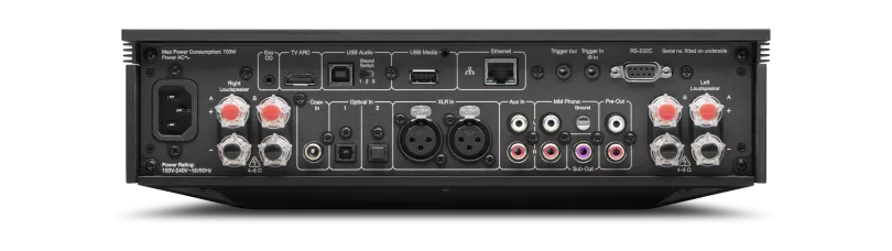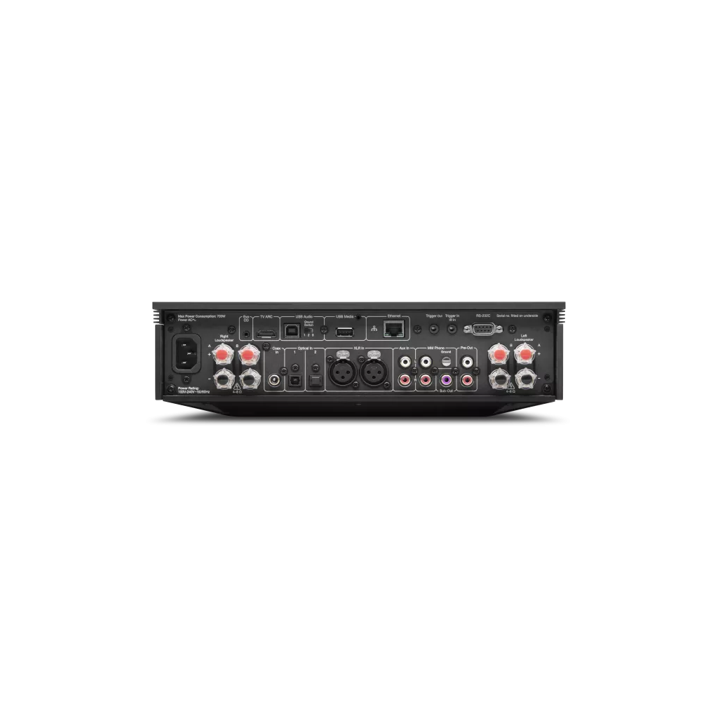 Široká konektivita zahrnující HDMI ARC, digitální vstupy, symetrické XLR a integrovaný MM phono předzesilovač.